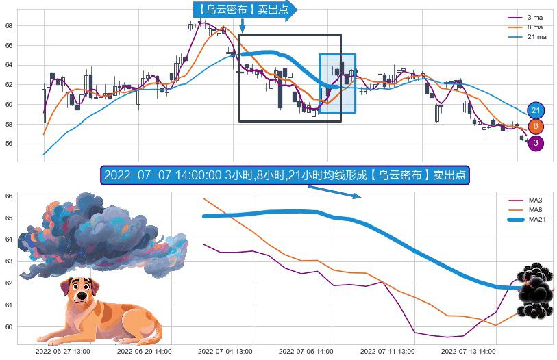 ⚀ 2022-06-30 14:00:00小时-2022-07-14 14:00:00小时显现 3小时-8小时-21小时均线 【乌云密布】卖出点 看空信号,后市看跌,卖出