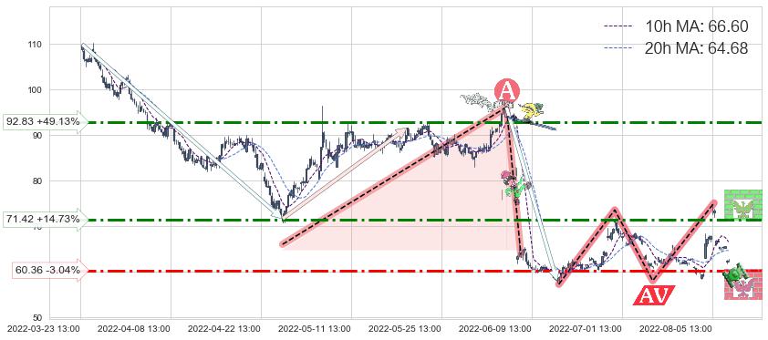 ♘ 阻力价格位71.42,可信任强度65.95%,距离最后交易2022-08-12 14:00形成的收盘价格62.25相差 +14.73%