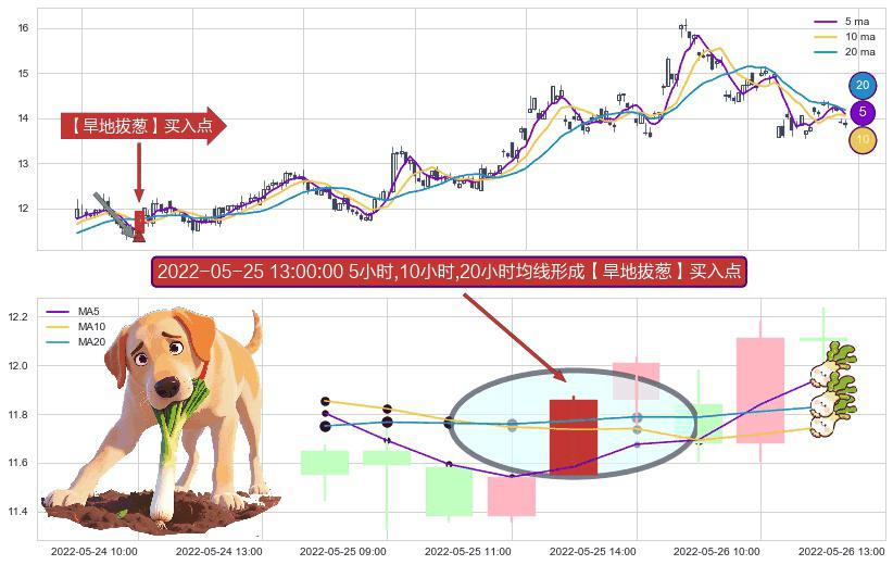 形态多维评估: ⚀ 2022-05-25 13:00:00小时显现 5小时-10小时-20小时均线 【旱地拔葱】买入点 看多信号,后市看涨,买入