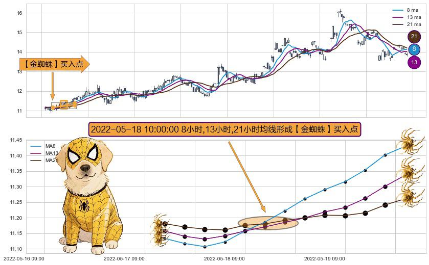 形态多维评估: ⚀ 2022-05-18 10:00:00小时显现 8小时-13小时-21小时均线 【金蜘蛛】买入点 看多信号,后市看涨,买入