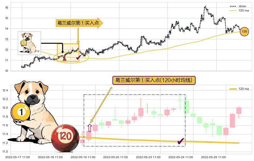形态多维评估: ⚀ 2022-05-19 10:00:00-小时显现 葛兰威尔均线 120小时均线 第买①入点 走势反转见底信号,后市看涨,买进信号