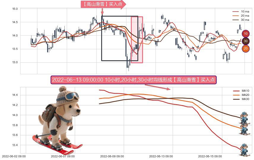 ⚀ 2022-06-08 09:00:00小时-2022-06-15 14:00:00小时显现 10小时-20小时-30小时均线 【高山滑雪】买入点 看多信号,后市看涨,买入