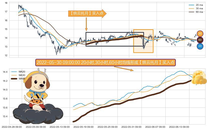⚀ 2022-05-13 13:00:00小时-2022-06-14 10:00:00小时显现 20小时-30小时-60小时均线 【烘云托月】买入点 看多信号,后市看涨,买入