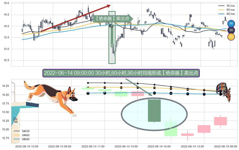 ⚀ 2022-06-14 09:00:00小时显现 30小时-60小时-90小时均线 【绝命跳】卖出点 看空信号,后市看跌,卖出