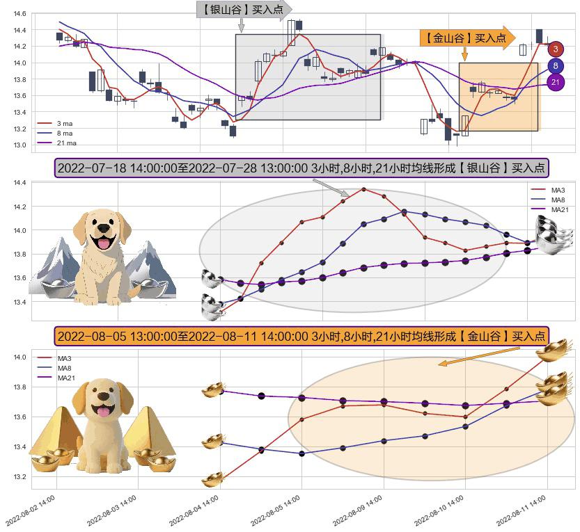 ⚄ 2022-08-05 14:00:00-小时至2022-08-11 14:00:00-小时显现 3小时-8小时-21小时均线 【金山谷】买入点 其再次确认了买入信号,可靠性更强,买入