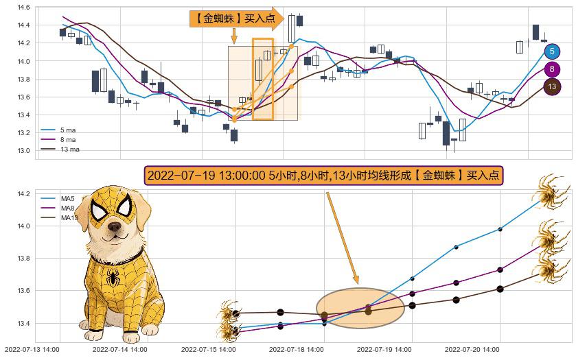 ⚀ 2022-07-19 13:00:00小时显现 5小时-8小时-13小时均线 【金蜘蛛】买入点 看多信号,后市看涨,买入