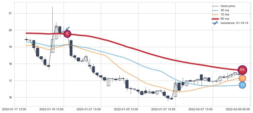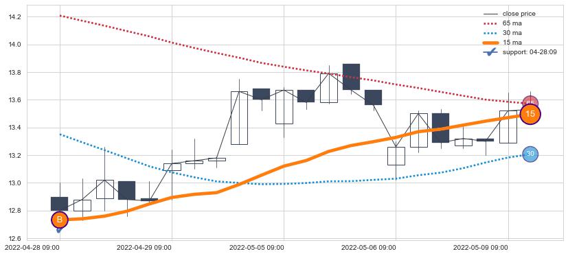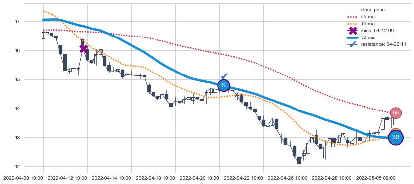⚃ 2022-05-17 14:00:00小时开盘价格在三条均线下收大阳线,收盘全突破均线,收盘股价上涨0.81%