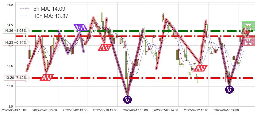 ♘ 阻力价格位14.36,可信任强度88.07%,距离最后交易2022-08-12 14:00形成的收盘价格14.21相差 +1.03%