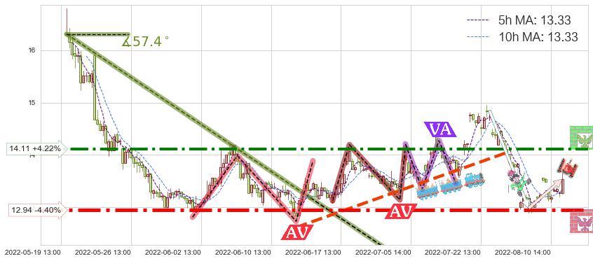 ♘ 阻力价格位14.11,可信任强度82.80%,距离最后交易2022-08-12 14:00形成的收盘价格13.54相差 +4.22%