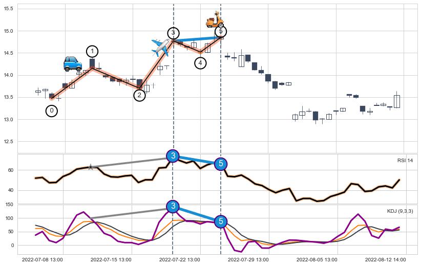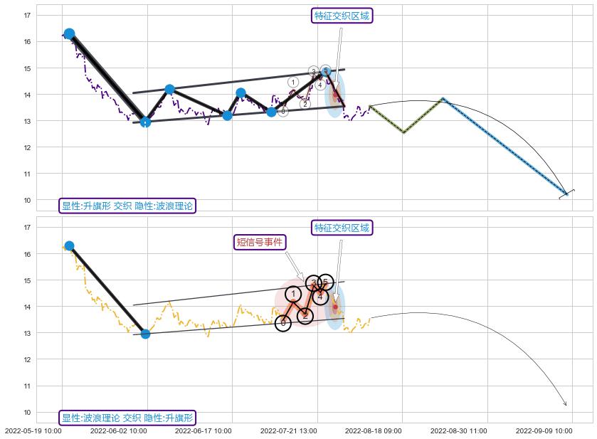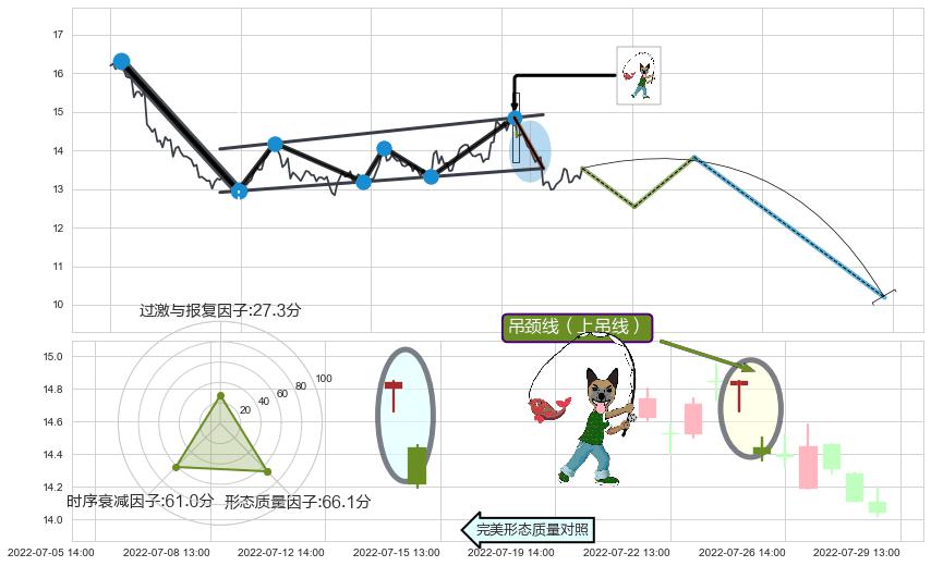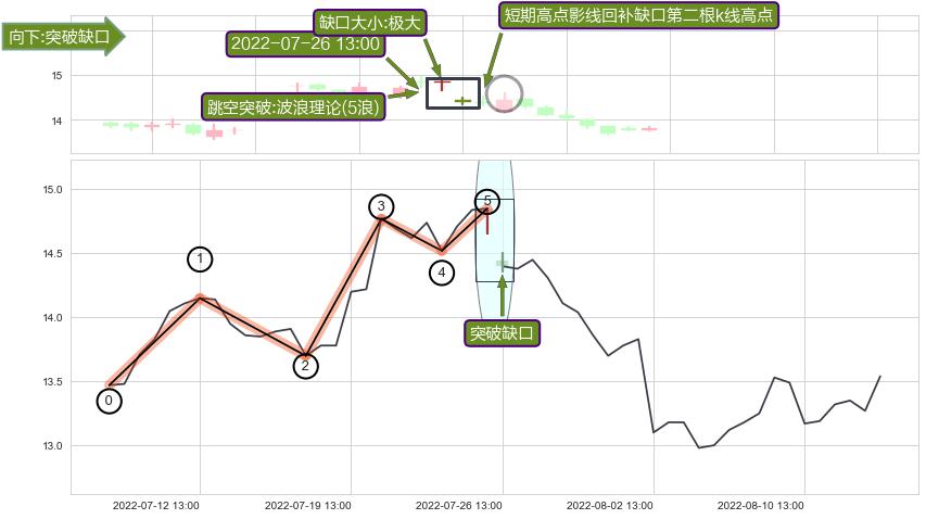 从2022-07-25 14:00至2022-08-03 14:00,共包含15个小时,阶段股价下跌-13.22%,阶段股价变动位移路程比: 1 : 1.3,2022-08-02 13:00向↘︎形成缺口,跳空下跌-5.28%˚