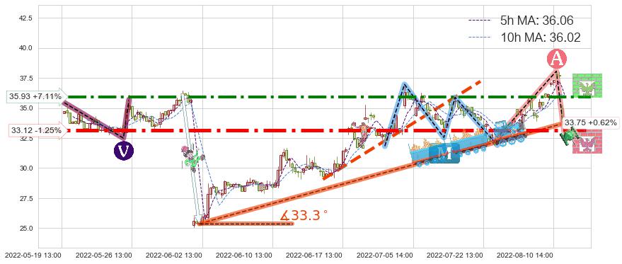 ♘ 在最后的上升阶段2022-06-02 11:00至2022-08-12 13:00存在 破位边缘的支撑位 ,支撑价格33.75,支撑可信任强度75.73%,其距离最后价格33.54相差 +0.62%