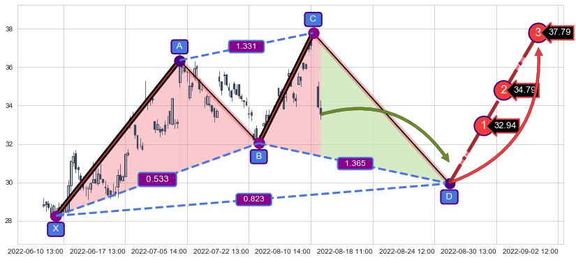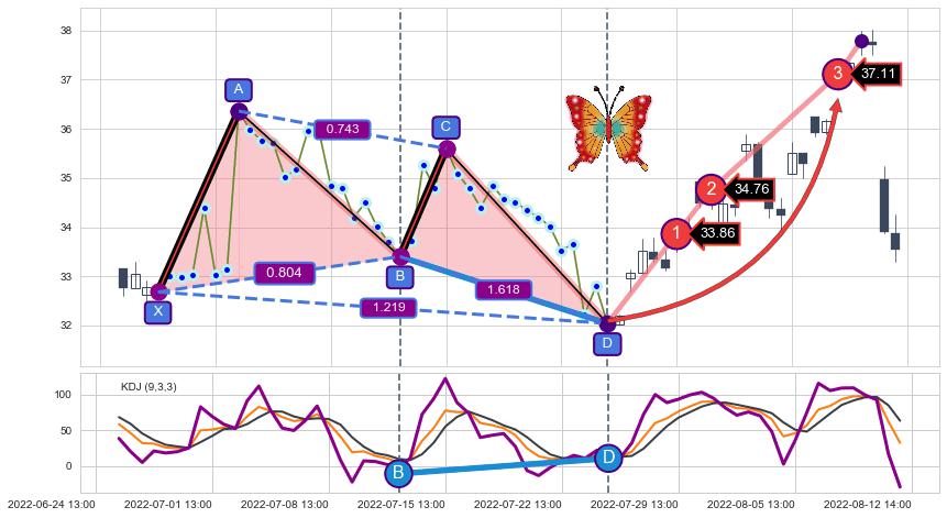 ➣ 已完成【蝴蝶】形态起点X: 06-28:14, 终点D: 07-26:13, 共40交易小时