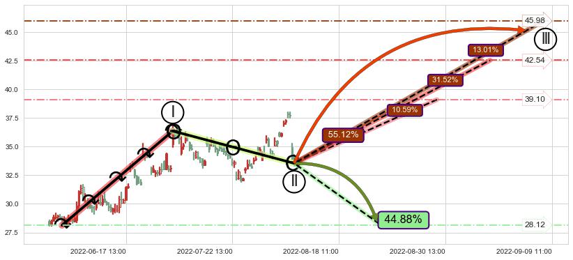 ➣ D点拟合预测价格29.94,距离最后交易收盘价格33.54相差 -10.73%
