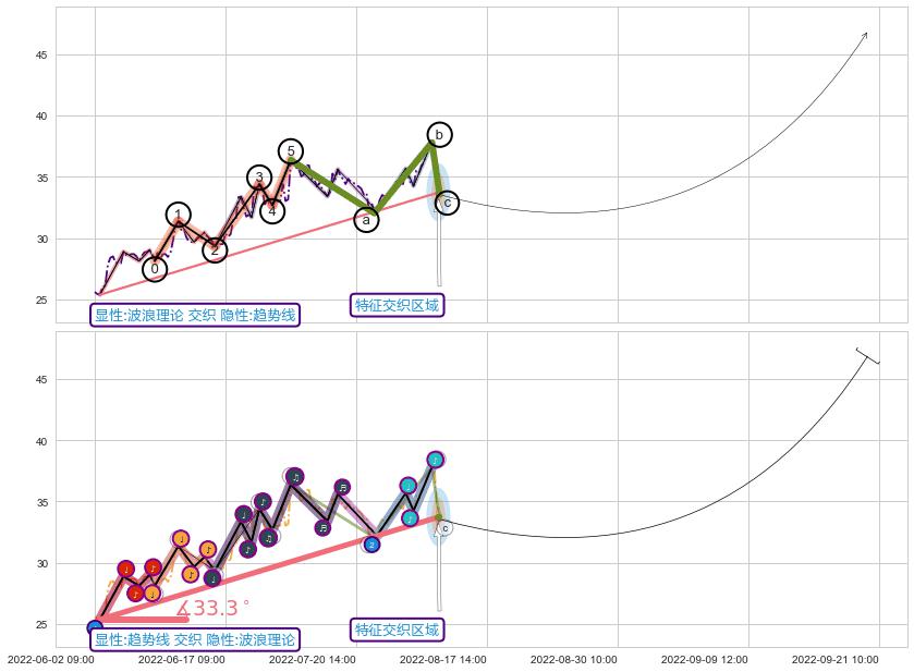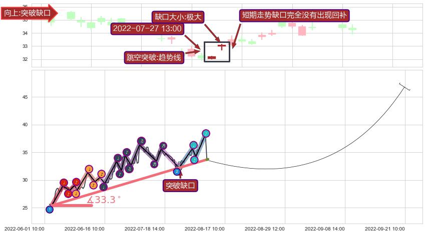 从2022-06-02 11:00至2022-08-12 13:00,共包含130个小时,阶段股价上涨32.40%,阶段股价变动位移路程比: 1 : 6,上涨趋势角度: 33.3,2022-06-23 13:00向⇪形成缺口,跳空上涨+7.86%