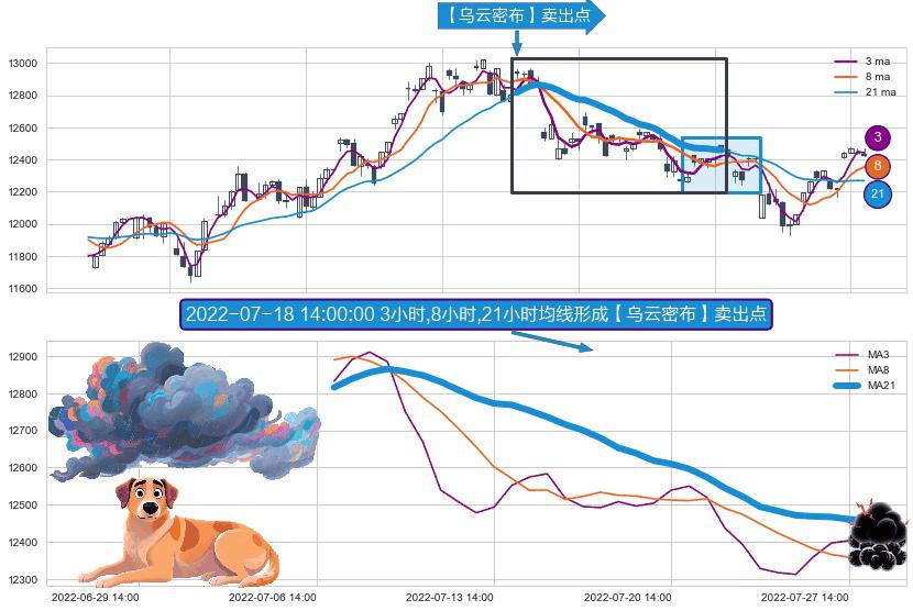⚀ 2022-07-07 13:00:00小时-2022-07-28 13:00:00小时显现 3小时-8小时-21小时均线 【乌云密布】卖出点 看空信号,后市看跌,卖出