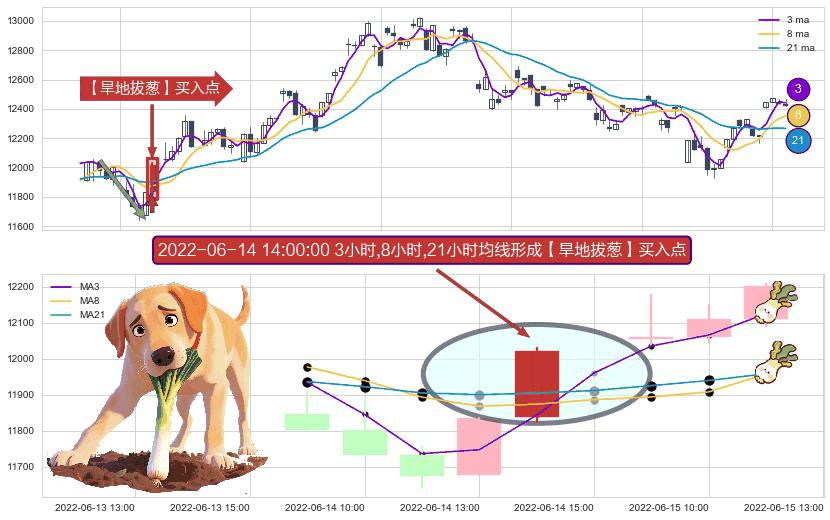 ⚀ 2022-06-14 14:00:00小时显现 3小时-8小时-21小时均线 【旱地拔葱】买入点 看多信号,后市看涨,买入
