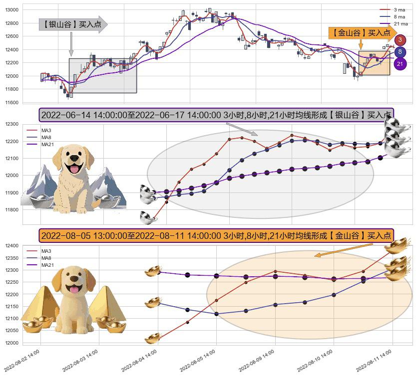 ⚄ 2022-08-05 14:00:00-小时至2022-08-11 14:00:00-小时显现 3小时-8小时-21小时均线 【金山谷】买入点 其再次确认了买入信号,可靠性更强,买入