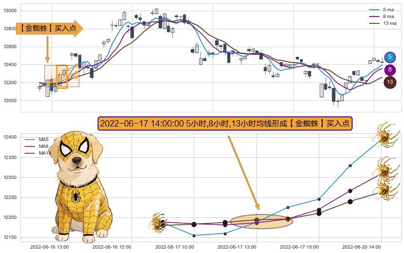 ⚀ 2022-06-17 14:00:00小时显现 5小时-8小时-13小时均线 【金蜘蛛】买入点 看多信号,后市看涨,买入