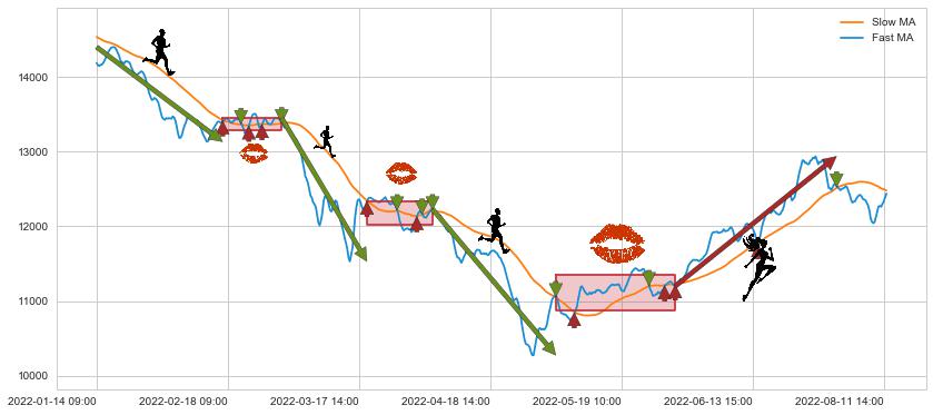05-05 14:00至05-30 09:00 慢线与快线多次接触,存在上下穿越,有缠绕