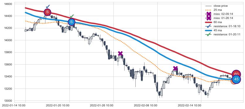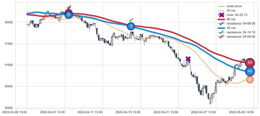 ⚄ 价格在均线遇到阻力后再次向下回落了【极短】距离, 第⑦卖出点 阻力效果【等待验证】