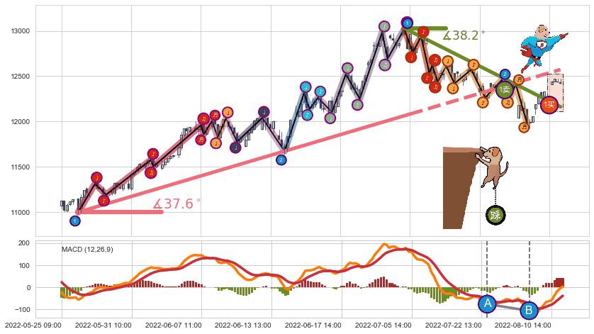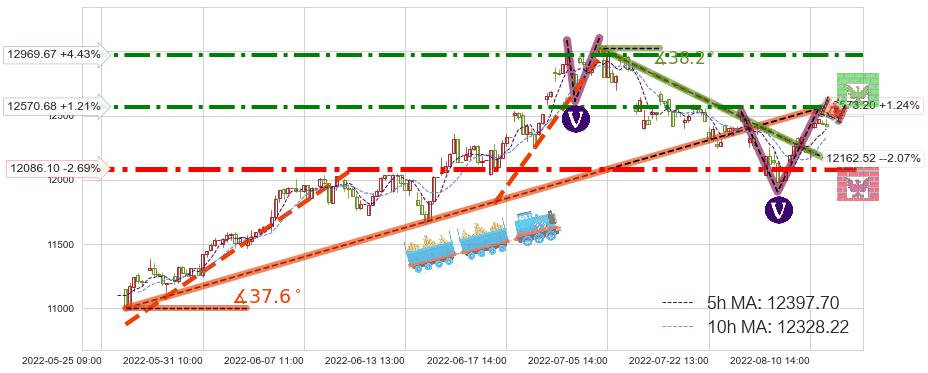 ➣ 2022-07-04 14:00-2022-08-11 13:00下跌趋势存在反转上涨[机会],其原下跌趋势的阻力位(12162.52)已被突破[强支撑信号],原下跌趋势角度: 38.2˚