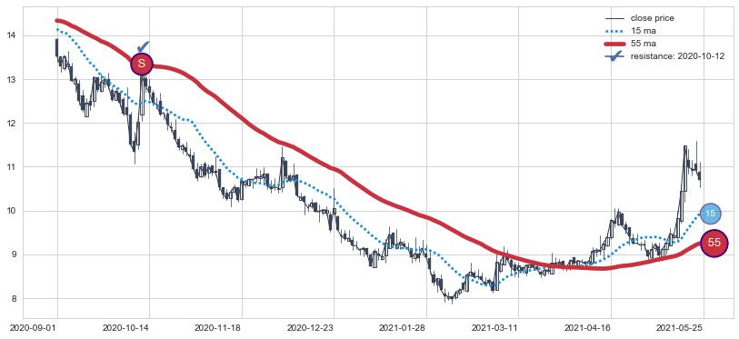 ➢ 最优均线组合共正确确认支撑阻力信号7处,正确确认率 70.00%
