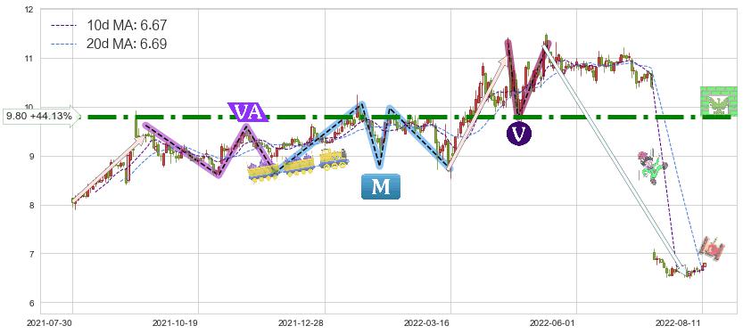 ♘ 阻力价格位9.80,可信任强度86.59%,距离最后交易2022-08-12形成的收盘价格6.80相差 +44.13%
