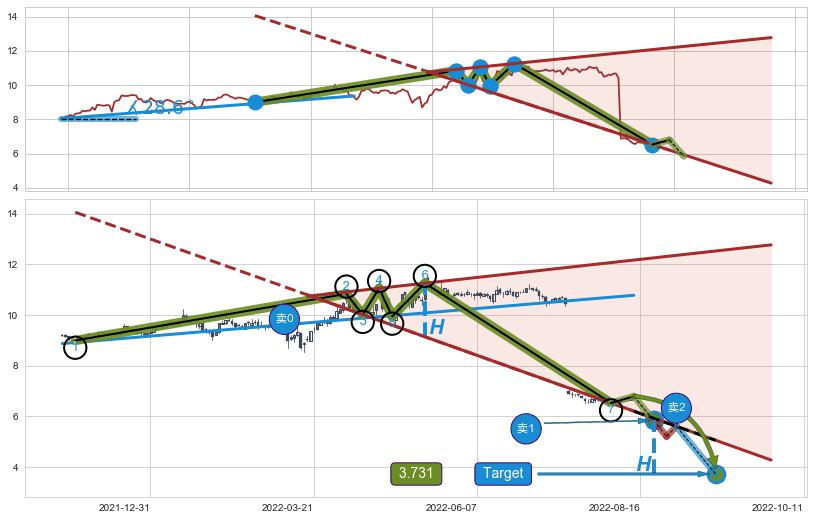 ➢ 最小反转跌幅→𝐇: 2.112 (逐步抬高阻力斜边最后的阻力点⑥与支撑边垂直距离)