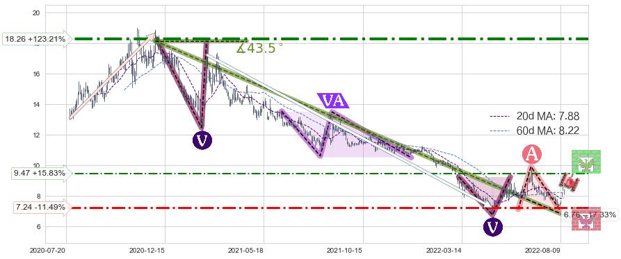 ♘ 支撑价格位7.24,可信任强度56.43%,距离最后交易2022-08-12形成的收盘价格8.18相差 -11.49%