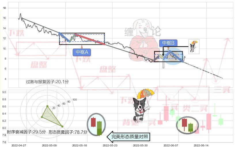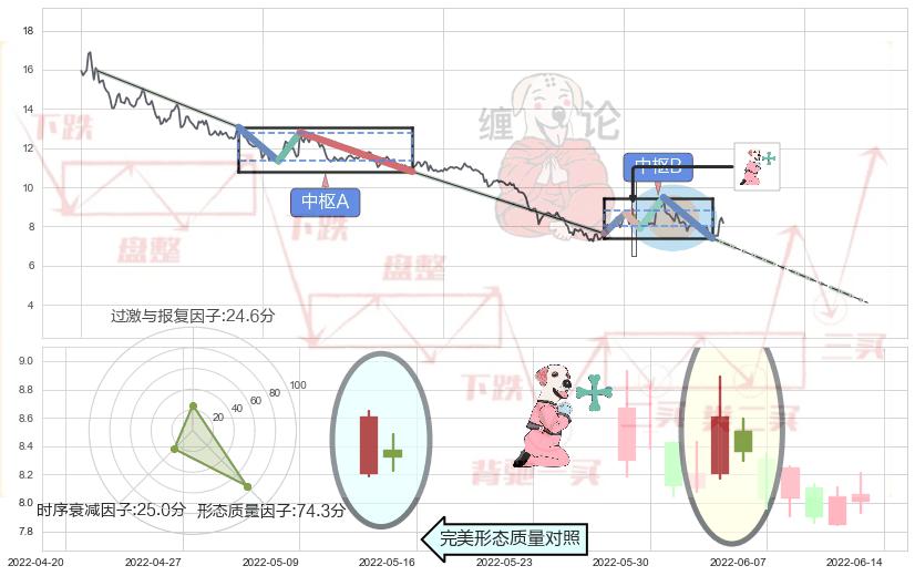 ➣ 下跌镊子线(n形磁铁) + 缠论中枢点破位中枢B支撑下拉信号叠加后【目标达成率】中等,【看空】信号叠加【存续影响中等】