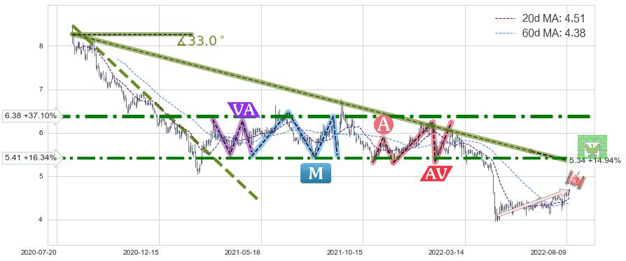 ♘ 阻力价格位5.41,可信任强度77.57%,距离最后交易2022-08-12形成的收盘价格4.65相差 +16.34%