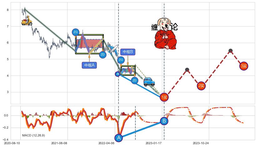 ➢ 缠论中枢点:猜想破位中枢B后持续下拉 → 下跌 → 破位中枢B支撑 → 持续趋势跟踪