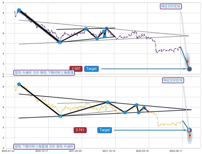 ➢ 下降对称三角整理临近target支撑拐点上涨 🔜 升旗形临近target支撑拐点上涨 综合量化分数:49.91 【中性】