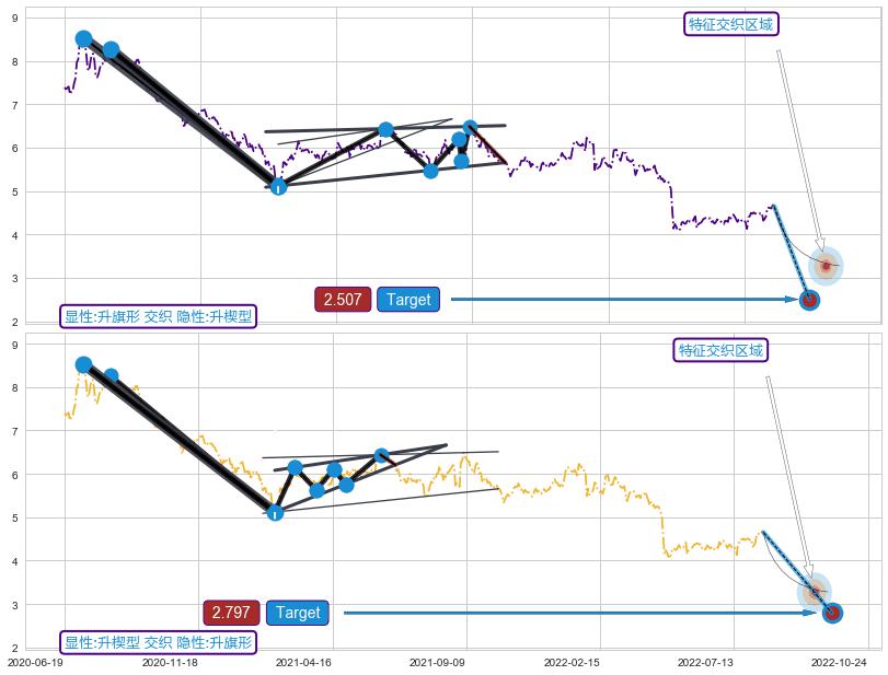 ➣ 上涨螺旋桨形态 + 升旗形临近target支撑拐点上涨信号叠加后【目标达成率】中等,【看多】信号叠加【存续影响中等】