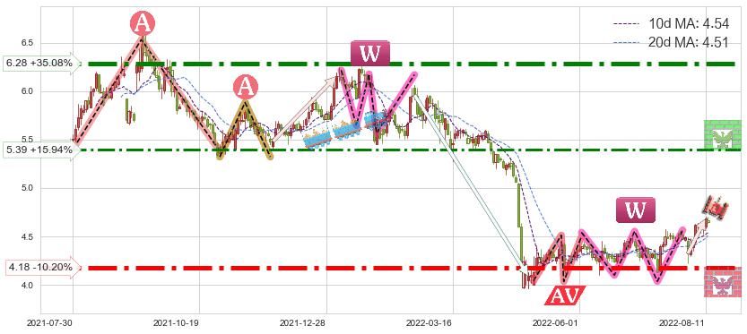 ♘ 阻力价格位5.39,可信任强度68.68%,距离最后交易2022-08-12形成的收盘价格4.65相差 +15.94%