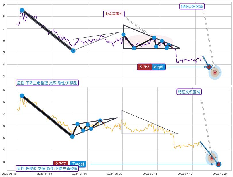 ➣ 上涨螺旋桨形态 + 下降三角整理临近target支撑拐点上涨信号叠加后【目标达成率】中等,【看多】信号叠加【存续影响中等】