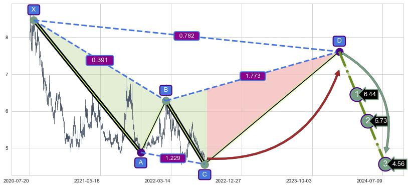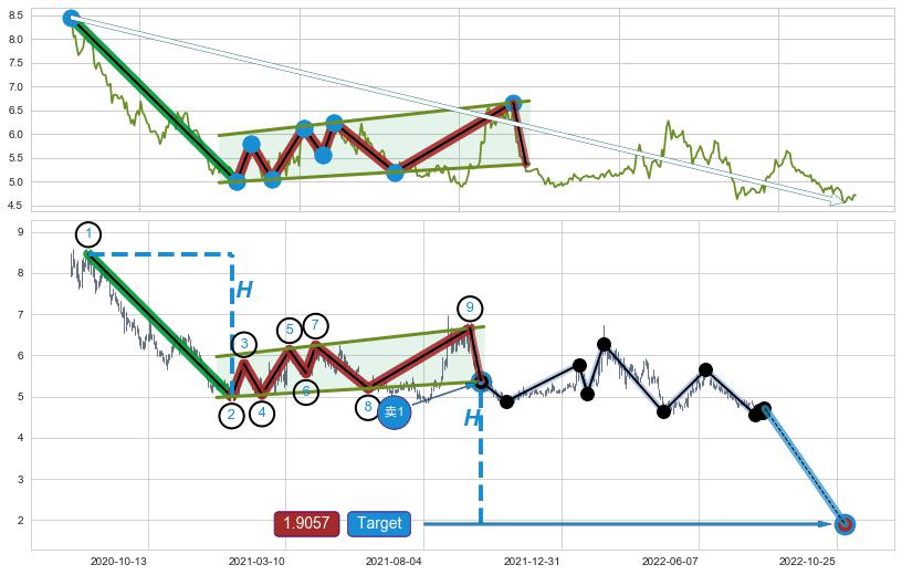 ➣ D点拟合预测价格7.61,距离最后交易收盘价格4.71相差 +61.57%