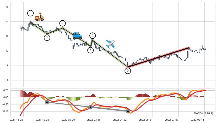 ➣ 趋势线:阻力位已击穿突破,猜想持续向上拉升上涨 → 上涨 →【突破】机会信号 → 大周期均值回复