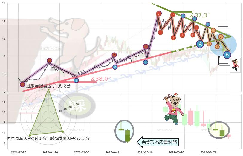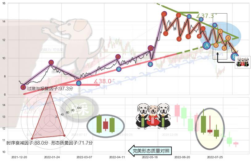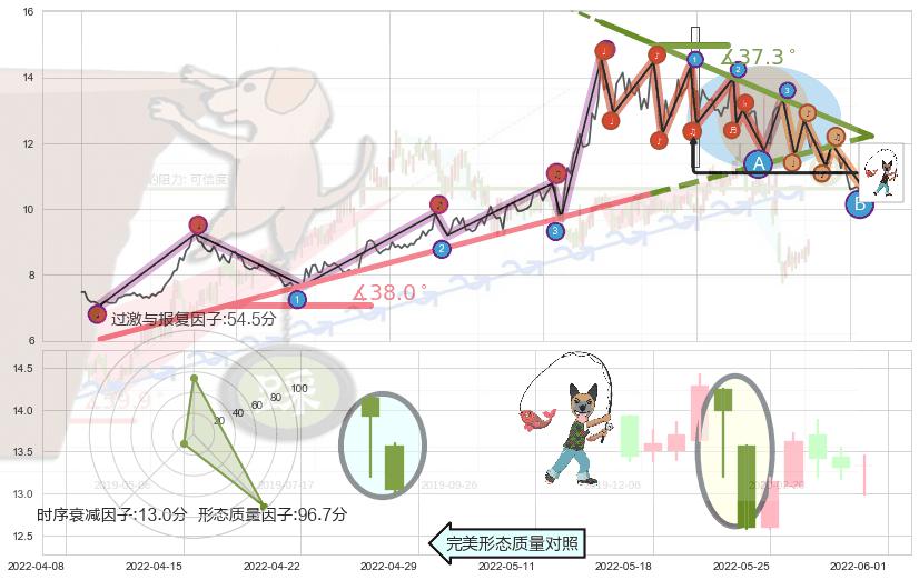 ➣ 2021-07-30-2022-04-28上升趋势存在反转[风险],其原上升趋势的支撑位(12.23)已破位[强阻力信号],原上升趋势角度: 38.0˚