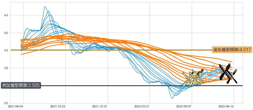 ➣ 70小时均线于(2022-08-11: 2.749)形成【死叉】基于【死叉历史模型】预测死叉后最低波谷价格: 2.222, 死叉后最低价格2.730,尚未达到预测最低波谷价格, 预期继续下跌