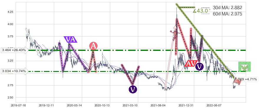 ♘ 阻力价格位3.464,可信任强度70.86%,距离最后交易2022-08-12形成的收盘价格2.740相差 +26.43%