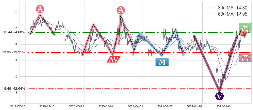 ♘ 阻力价格位15.44,可信任强度99.00%,距离最后交易2022-08-12形成的收盘价格14.75相差 +4.68%