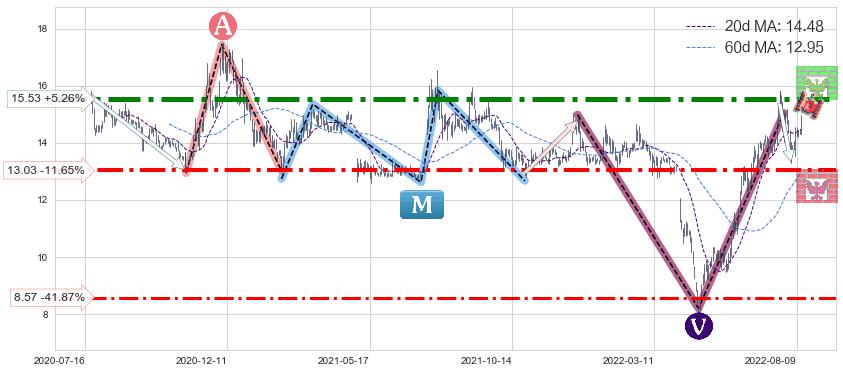 ♘ 阻力价格位15.53,可信任强度95.98%,距离最后交易2022-08-12形成的收盘价格14.75相差 +5.26%
