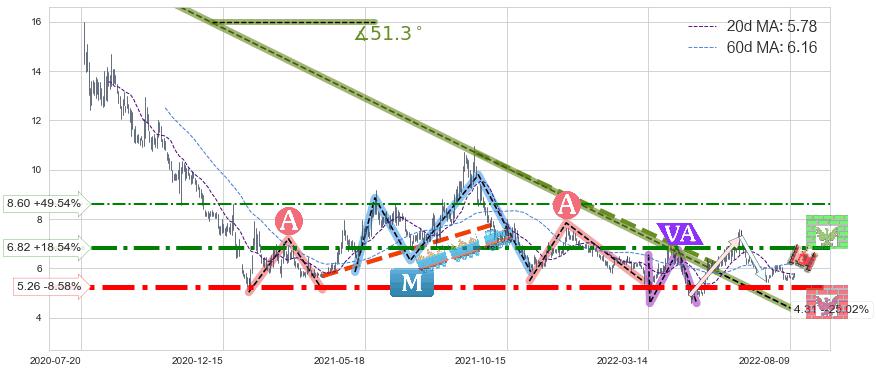 ➣ 【仅预测突破】最后价格:5.75与预测突破价格:7.30→【空间中等】后续最小【反转】第一目标价格→(2022-10-31: 9.71 )