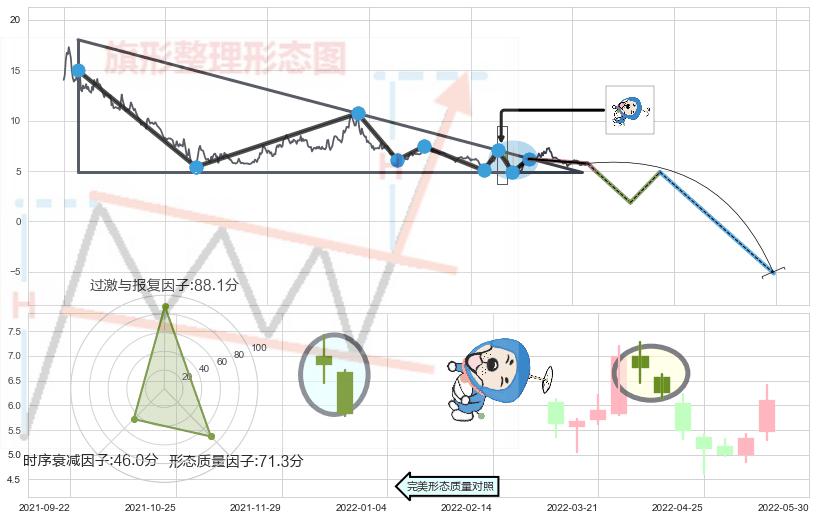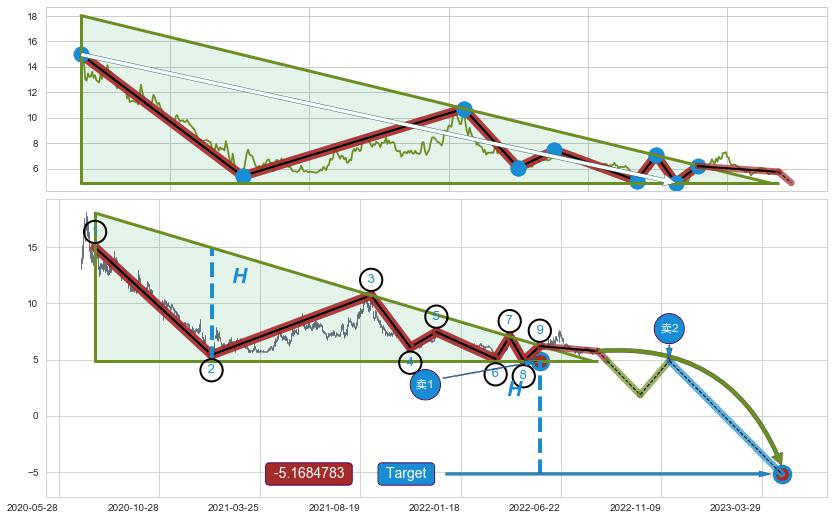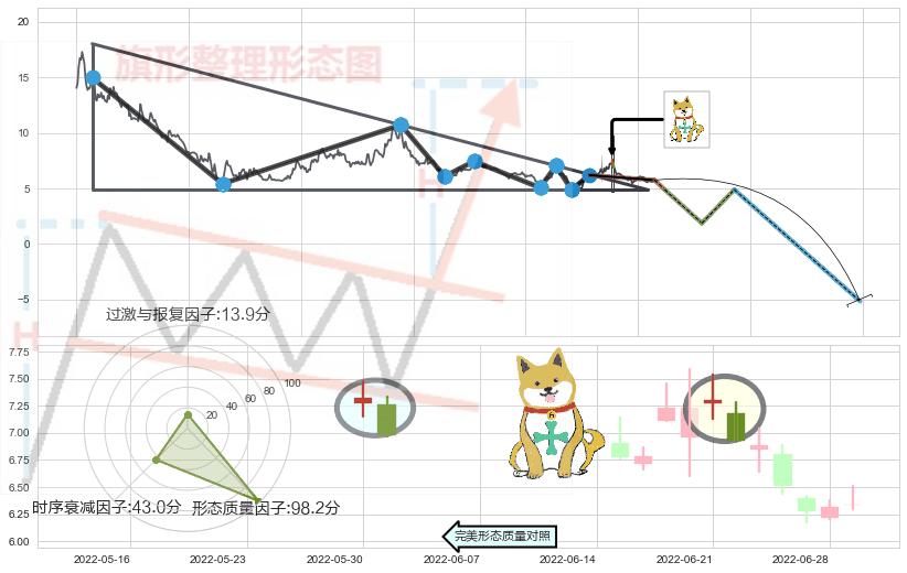 ➣ 【未确认突破,预测即将形成突破】下降三角形整理起点:2020-07-22, 预测突破点:2022-05-23,形态共444交易日