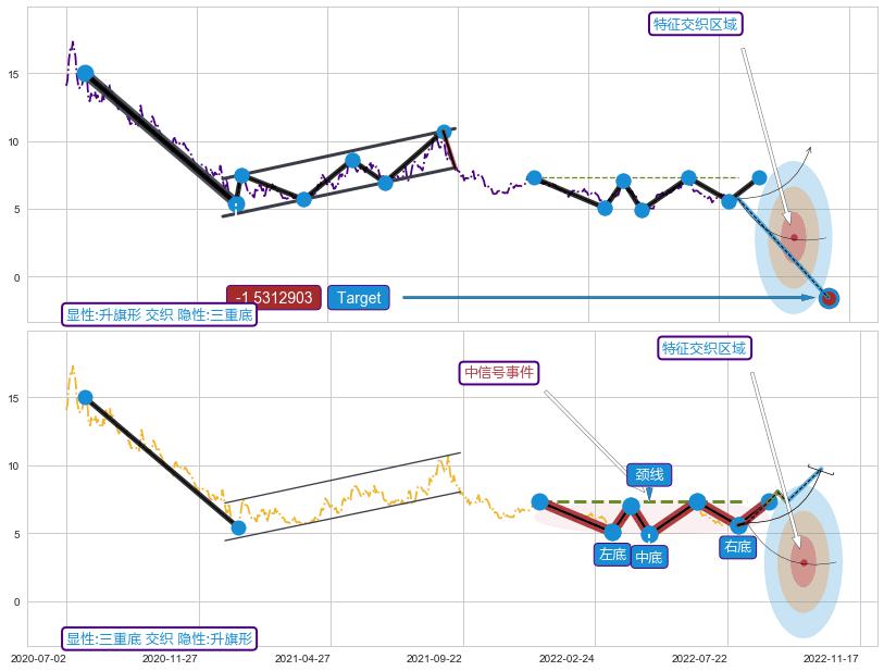 ➣ 下跌螺旋桨 + 下降三角整理临近支撑猜想转换阻力下跌信号叠加后【目标达成率】低,【看空】信号叠加【存续影响大】