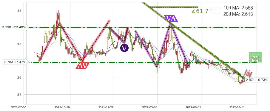 ♘ 阻力价格位2.783,可信任强度62.47%,距离最后交易2022-08-12形成的收盘价格2.590相差 +7.47%