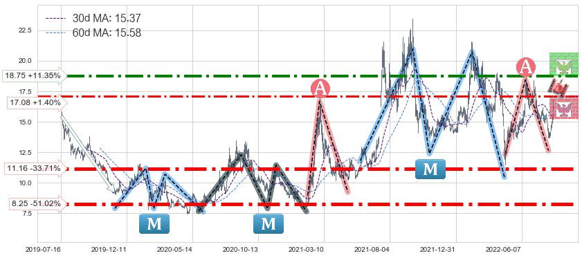 ♘ 阻力价格位18.75,可信任强度75.28%,距离最后交易2022-08-12形成的收盘价格16.84相差 +11.35%