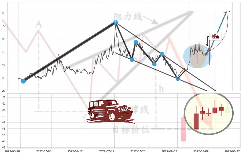 ➢ 收盘价(2022-06-22: 47.62 )→再次回踩→第一根k线高点(2022-06-13: 50.44 )