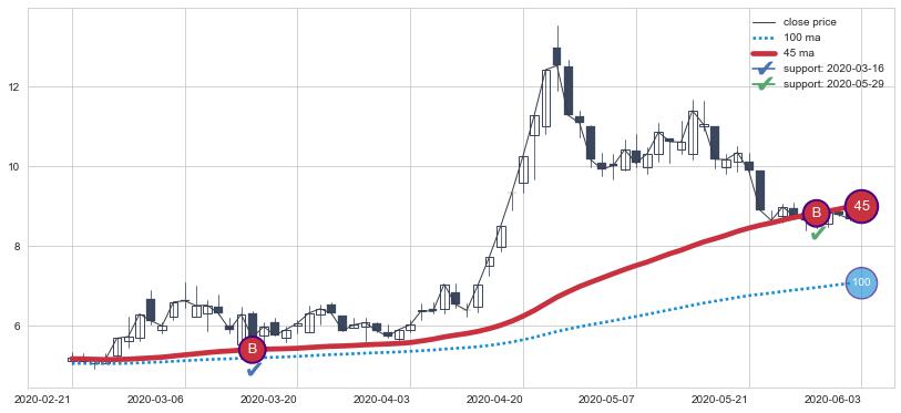 ➣ 45小时均线于(2022-05-27: 7.79)形成【金叉】基于【金叉历史模型】预测金叉后最高波峰价格: 8.86, 金叉后最高价格10.62,已经上涨超出预测最高波峰价格, 预期回调